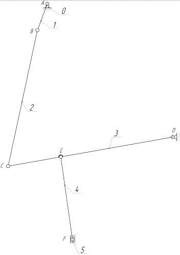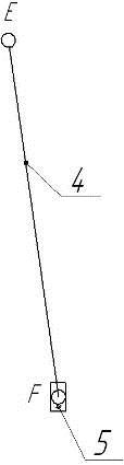К коромыслу 3 присоединен шатун 4 образуя с ним кинематическую пару (т.E). К шатуну 4 присоединен ползун 5 образуя вращательную кинематическую пару (точка F). Ползун 5 двигаясь вдоль направляющей образуя с ней поступательную кинематическую пару (т. F0).