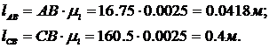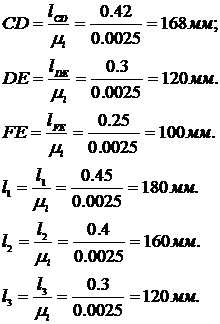 Далее переводят все геометрические линейные размеры в масштабный коэффициент длин и получают величины отрезков, изображающие заданные геометрические параметры в составе соответствующей кинематической схемы: