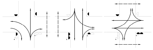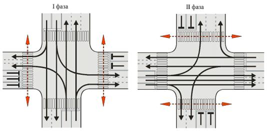 В целях сокращения задержек транспортных средств и пешеходов надо стремиться к уменьшению числа фаз в цикле регулирования. Введение третьей фазы (для пропуска левоповоротных потоков транспорта или специально для пешеходов) является необходимым только при выполнении хотя бы одного из двух условий /3/: