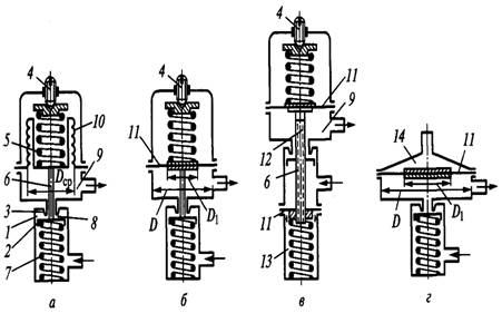 В редукторе прямого хода (рис. 1, а) клапан открывается в направлении усилия, возникающего за счет действия газа высокого давления (по потоку газа). В редукторе обратного хода (рис. 1, б) клапан открывается против усилия возникающего за счет действия газа высокого давления (против потока газа),