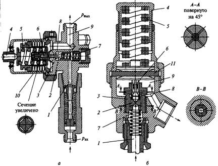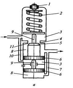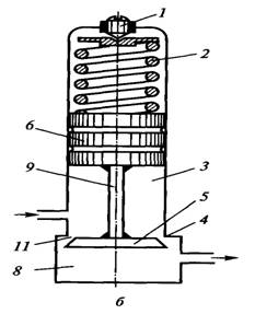 - регулировочный винт; 2 - основная пружина; 3 - полость высокого давления; 4 седло клапана; 5 клапан; 6 поршень (плунжер); 7 канал низкого давления; 8 - полость низкого давления; 9 - шток; 10 - канал высокого давления; 11 - дросселирующее отверстие Отличие редуктора, изображенного на рисунке 5, а, от редуктора, показанного на рисунке 5, б, заключается в том, что в первом полости высокого и низкого давления 3 и 8 состоят из двух частей, соединенных соответственно каналами 10 и 7; во втором редукторе этого соединения нет. Редуктор прямого хода. Газ высокого давления входит в полость 3 (рисунок 5). Дросселирование газа происходит в дросселирующем отверстии 11 между клапаном 5 и седлом клапана 4. Газ пониженного давления поступает в полость низкого давления 8 и оттуда к потребителю. В редукторе, работающем по схеме, приведенной на рисунке 4, а, клапан 5 разгружен от усилия, действующего на него со стороны пружины 2 и высокого давления в полости 3, путем установки двух поршней 6. В полости 3 и 8 над поршнями по каналам 10 и 7 поступает газ, давлением которого поршни 6 разгружаются. В редукторах, работающих по схеме, представленной на рисунке 4, б, усилие, действующее на клапан 5 со стороны пружины 2 и давления газа в полости 3, компенсируется за счет давления на поршень 6, который штоком 9 жестко связан с клапаном 5.