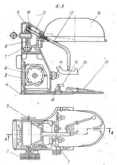 - кронштейн; 2 - шкив; 3 - штурвал; 4 - плита; 5 - корпус; 6 - электродвигатель; 7 и 14 - червяки; 8 - червячное колесо; 9 - прижимной рычаг; 10 - подшипник; 11 - месильный рычаг; 12 - месильный орган; 13 - колпак; 15 - запорная планка; 16 - лопасть; 17 - ножной рычаг; 18 - упорный уголок.