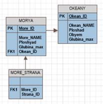 · Моря (Morya). В этой таблице хранится вся информация о морях, например крупнейшее по площади море, у какой море глубочайшая точка в мире и т.д. Атрибуты - номер, название море, площадь, максимальная глубина, номер океана, ракурс.