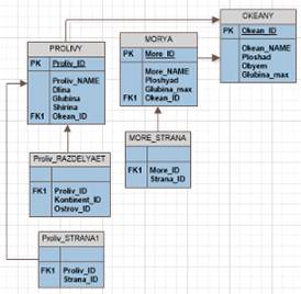 · Проливы (Prolivy). Здесь хранится информация о своеобразных водный мостах между водными бассейнами. Атрибуты - номер, название пролива, длина, глубина и ширина пролива, номер океана и ракурс.