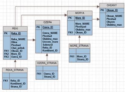 · Океаны (Okeany). Эта сущность вводится для хранения информаций об океане, о водной поверхности Земли, который окружает сушу. Атрибуты - номер, имя, площадь, объем, максимальная глубина, атрибуты ракурс и земля.