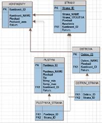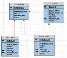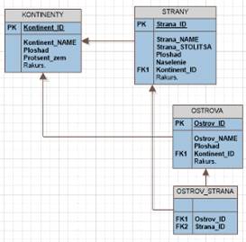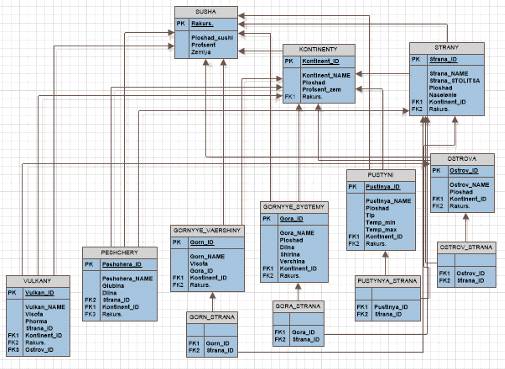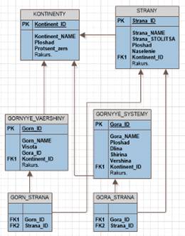 · с сущностям острова, пустыни, горные системы и горные вершины связываются таблицы с номерами стран и континент, поскольку они находятся не только на одних континентах и странах, и затем эти таблицы связываются с сущностями континенты и страны;