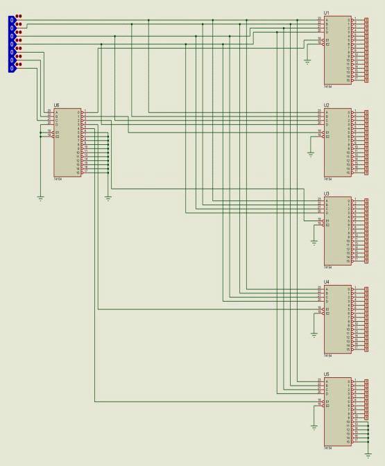 Поскольку число входов устройства k=4, то четыре старших разряда подаются на первую ступень, которая состоит из одного дешифратора К555ИД6. Его выходы соединяются с входами А3 каждого дешифратора второй ступени для управления ими. Так как по заданию число выходов устройства I=70, то необходимо использовать 5 дешифраторов для второй ступени. Четыре младших разряда подаются на адресные входы этих дешифраторов.