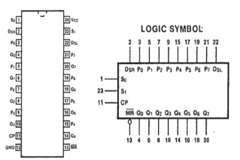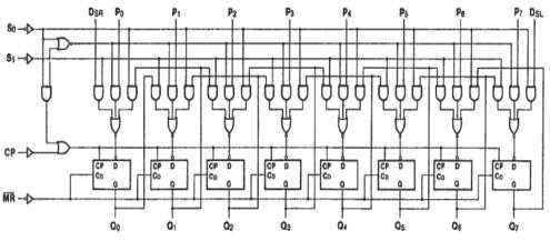 При S0 = 1 и S1 = 1, а также по фронту на CP, в регистр загружаются данные с входов P0, P1, … ,P7. Когда S0 = 0, а S1 = 1 будет происходить запись с последовательного входа DSR. По первому положительному фронту на CP происходит сдвиг, и состояние на входе DSR передастся в триггер с выходом Q0. По второму фронту состояние этого триггера передастся триггеру с выходом Q1, а вQ0 запишется новое состояние входа DSR и т.д. Аналогично вводятся данные с входа DSL при S0 = 1, а S1 = 0, только в этом случае сдвиг будет происходить в обратную сторону.