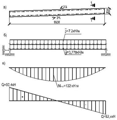 расчетная схема; в) эпюра моментов и поперечных сил балки