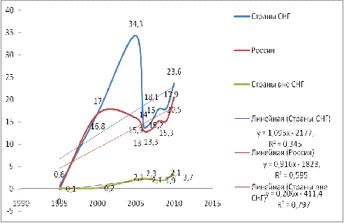 По данным, представленным на рисунке 2.1, наблюдается устойчивая тенденция роста объема поставок товаров кондитерской отрасли в Россию. Следует отметить, что в 1995 г. поставки не осуществлялись, то к 2010 году этот показатель возрос до 20,5 млн. долл. США, т.е. экспорт вырос в 20 раз. В целом наблюдается рост объемов экспорта по данной товарной позиции, но отсутствует устойчивая тенденция.