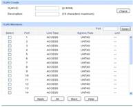 В данном окне необходимо ввести идентификационный номер VLAN, дать описание сети. При нажатии на кнопку "Check" происходит проверка идентификатора VLAN. Ниже в таблице, необходимо выбрать какие порты будут объединены во VLAN, так же есть возможность установить различные правила для пользователей портов.