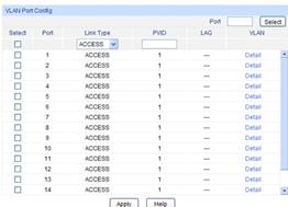 порты, для этого заходим вменю VLAN → 802.1Q VLAN → PortConfig,