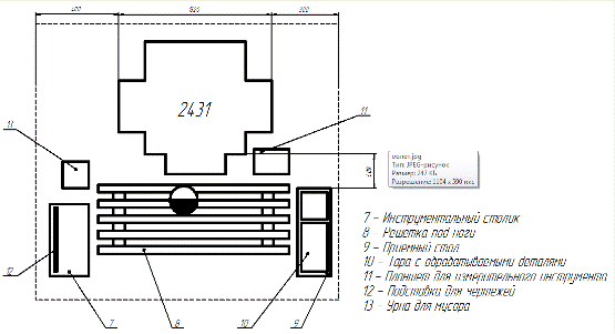 размещение основного оборудования, оснастки, приспособлений, заготовок и