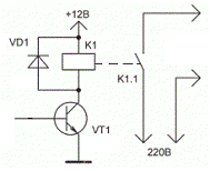 Для предотвращения повреждения транзистора высоковольтным импульсом ЭДС самоиндукции, который возникает при обесточивании обмотки реле, необходимо поставить диод VD1. Диод срабатывает только при размыкании цепи.