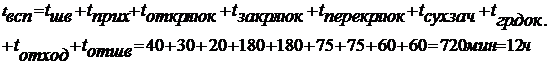 всп= tшв+tотш+tпод,я+tсн.я+tприх+tотк.л+tпер.л+tзак.л+tсух.з+tмой.+tсуш.+tотт.+t.охл+tгд=90+90+45+45+180+40+60+30+480+480+240+720+180+60=2740мин=45ч.
