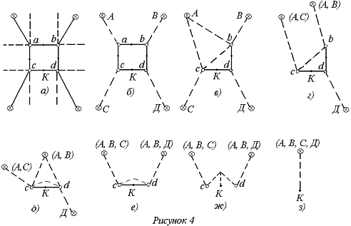 В таблице 1 номера систем соответствуют количеству узловых точек в системе и номерам рисунков; через п обозначено число ходов одинаковой длины [S] и весом, равным единице, сходящихся от твердых пунктов в узловых точках а, b, с, d.