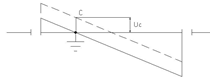 При подготовке рабочего места на ВЛ следует обращать особое внимание на надёжность контактов защитных заземлений с фазными проводами и заземлителем. Нельзя забывать, что при случайной потере контакта (разземлении линии) точка нулевого потенциала в то же мгновение может изменить своё местоположение, а напряжение на рабочем месте превысить допустимое значение Uс (рис 4). Следовательно, для гарантии безопасности в месте производства работ целесообразно устанавливать параллельно два заземления.