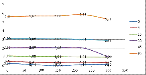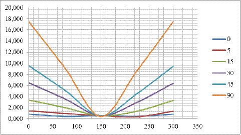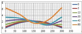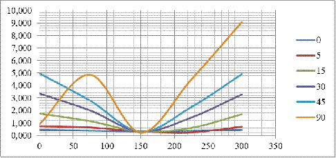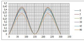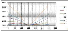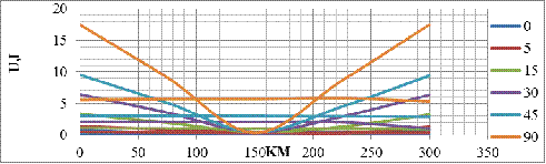 График зависимости наведенного напряжения от длины участка ВЛ с разными углами от 0- 90 гр.