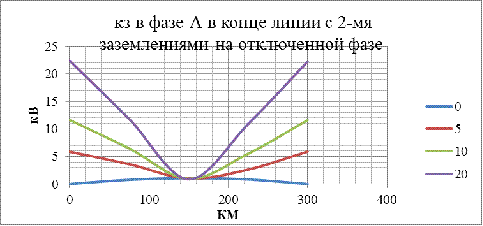 ) КЗ в фазе А в конце линии с тремя заземлениями -в начале и в конце, на отключенной ВЛ