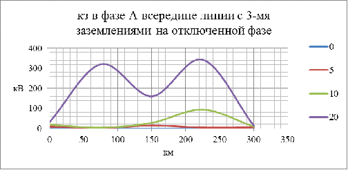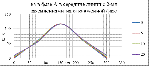 ) КЗ в фазе А в середине линии с тремя заземлениями -в начале и в конце, на отключенной ВЛ