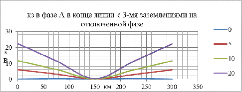 При R = 0 Ом (сопротивление заземлителя в начале, в середине и в конце линии), l- длина линии (км)