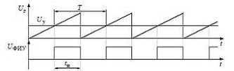 Для схемы ИППТ изображённого на рисунке 4 необходимо обеспечить стабилизацию выходного напряжения преобразователя который по заданию должен равняться примерно 2%. Поэтому в разработке схемы управления решил применить схему с обратной связью т. к он компенсирует Kcт равный 2 %. Здесь ГПН - генератор пилообразного напряжения, формирующий последовательность пилообразных импульсов постоянной частоты н амплитуды рисунок 7. Эти импульсы сравниваются в компараторе К с напряжением Uy, в результате чего формируются прямоугольные импульсы с длительностью tи, которая может регулироваться уровнем напряжения управления Uy.