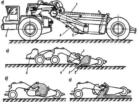 а - самоходный скрепер; б - набор грунта в ковш; в - груженый ход; г -