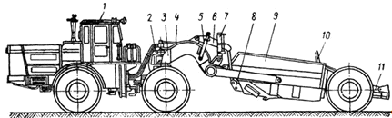 двухмоторный; ж - самоходный с задним двигателем; з - скрепер-бульдозер; 1 -