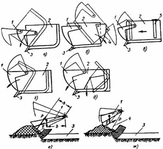 На рис. 69 представлены схемы разгрузки ковша скрепера. При свободной разгрузке, а она применяется в ковшах небольшой емкости, ковш опрокидывается и грунт высыпается под действием собственного веса (рис. 69, а, б).