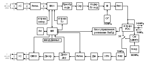Внутренний блок IDU состоит из передающего и приемного трактов. Установленные на входе и выходе этих трактов устройства сопряжения (УС) служат для согласования параметров IDU с транспортными линиями в рамках протокола G.-703 МСЭ-Т. Устройства сопряжения в зависимости от назначения могут быть электрическими или оптическими (G.-957). Принятые цифровые потоки данных преобразуются из квазитроичного кода HDB-3 в двоичный код NRZ и проходят устройства регенерации цифровых сигналов. Регенераторы исключают линейные искажения, внесенные кабелем. Они выделяют тактовую частоту цифровых потоков с помощью выделителя тактовой частоты (ВТЧ) и восстанавливают амплитуду, длительность и фронт импульсной последовательности с помощью решающего (РУ) и формирующего устройств (ФУ).