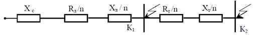 (точка К2), индуктивное сопротивление системы определяется по выражению: