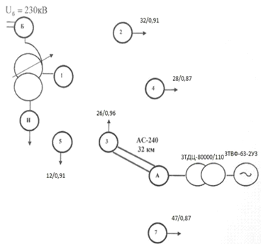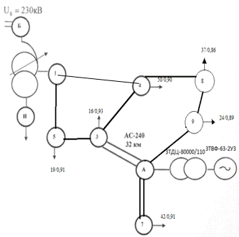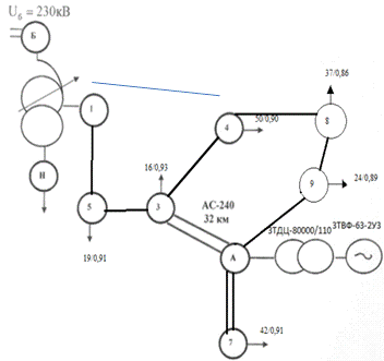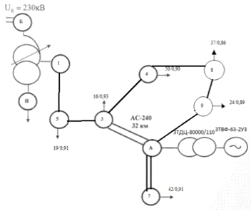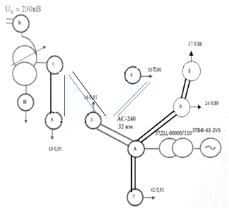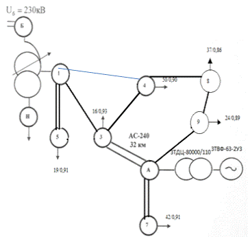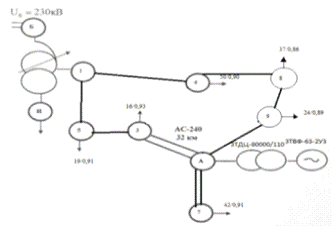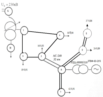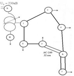 Расчет кольца выполнен с помощью программы RASTR, в узлах указаны мощности нагрузки, сечения линий условно приняты АС-240.