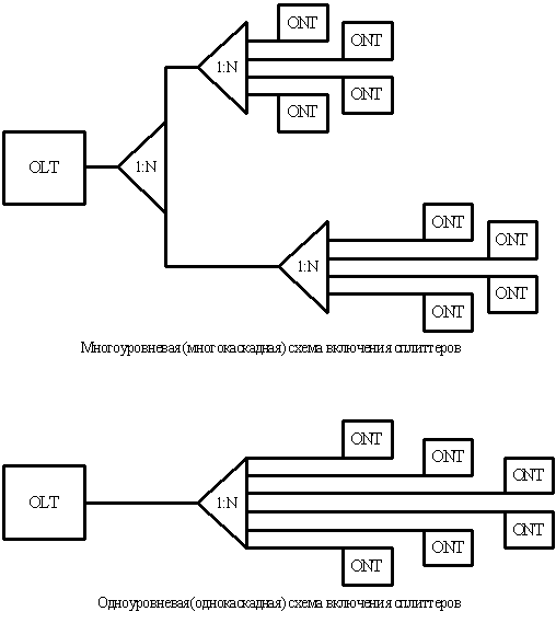 На сети может быть использована как одноуровневая (однокаскадная) схема включения сплиттеров без последовательного их включения друг за другом, так и многокаскадная схема с последовательным размещением (рисунок 2.2).