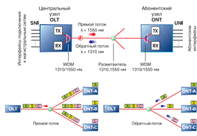 Наоборот, потоки данных от разных абонентских узлов в центральный узел, совместно образующие обратный (восходящий) поток, передаются на длине волны 1310 нм. В OLT и ONT встроены мультиплексоры WDM, разделяющие исходящие и входящие потоки.