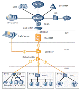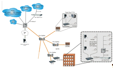 · передача разнообразных приложений (голоса, видео, данные) - это фактически позволило производителям добавлять соответствующие интерфейсы на OLT для подключения к магистральной сети и на ONT для подключения к абонентам;