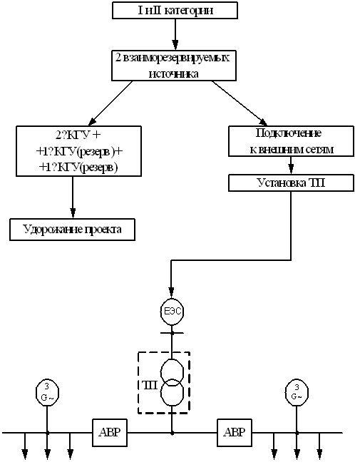 Схема главных соединений. Согласно [1], электроснабжение потребителей I и II категории должно осуществляется от двух независимых взаиморезервируемых источников питания. Так как на предприятии принято решении об установке - КГУ на базе газопоршневого двигателя, принимаем к установке двух таких агрегатов. Далее построение схемы электроснабжение изобразим в виде схемы на рисунке 3.1.