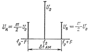 Спектр АМ колебания (7) приведен на рисунке 3. Ширина спектра равна удвоенной частоте модуляции: ∆fAM=2F. Амплитуда несущего колебания при модуляции не изменяется; амплитуды колебании боковых частот (верхней и нижней) пропорциональны глубине модуляции, т. е. амплитуде Х модулирующего сигнала. При m=1 амплитуды колебаний боковых частот достигают половины несущей (0,5U0).