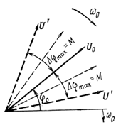 Фазомодулированное колебание наглядно характеризуется векторной диаграммой рисунок 4, построенной на плоскости, вращающейся по часовой стрелке с угловой частотой w0. Немодулированному колебанию соответствует неподвижный вектор U0. Фазовая модуляция заключается в периодическом с частотой Ω повороте вектора U относительно U0 на угол ∆φ(t)=aXsinΩt. Крайние положения вектора U обозначены U’ и U’’. Максимальное отклонение фазы модулированного колебания от фазы немодулированного колебания