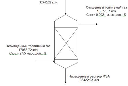 (масс.), температура регенерированного раствора моноэтаноламина tр = 45°С, количество газа G1=15592 м3/ч, глубина удаления сероводорода 97%.