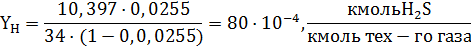 где y1, y2 cответственномольная(объемная)доля сероводорода в исходном и очищенном газах.