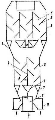Пневмоклассификатор состоит из двух смежных пневмошахт: первичной 1 и