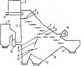 При нарушении равновесия на полках 6 они наклоняются на угол 2φ и высыпают подсушенные карбонатные частицы, которые падают в бункер 8, а мелкая фракция либо идет в бункер 7 через окно 10 ,либо оседает на полке 6. Вентилятор 12 увлекает мелкие частицы с полок 6 над бункером 7 и из зоны над полками 6. Мелкие частицы оседают в бункере 7 и циклоне 13. Последний соединяется с двумя вентиляторами 12 и 14. Вентилятор 14 создает аэродинамическое давление на частицы и выносит их в верхнюю часть слоя. Затем мелкие частицы, как более легкие, падают в верхнюю часть камеры 1 и через полки 4 в бункер 7. Воздух в классификаторе движется по замкнутой схеме, что исключает пылевыделение.