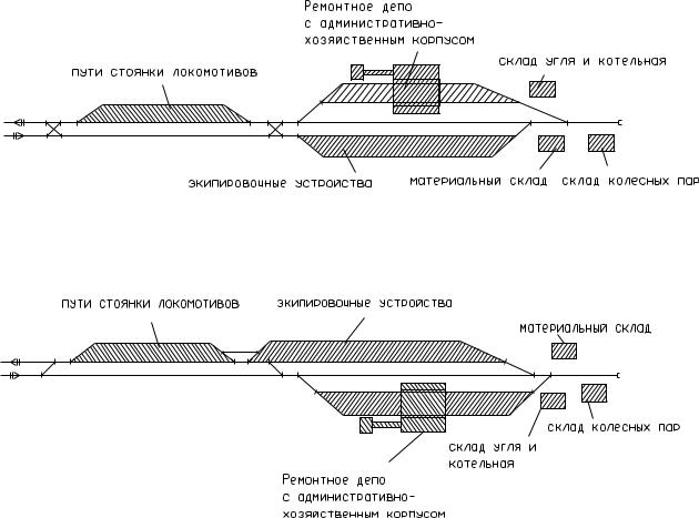 Тип схемы определяется, как правило, взаимным расположением ремонтного депо (при его наличии), экипировочных устройств и путей стоянки локомотивов.