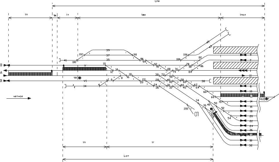 допустимо определять не для всех путей приемоотправочных парков, а среднее для каждого парка или секции соответствующей специализации. При этом расстояния lвх и lг можно рассчитывать для средних путей парков или секций по примеру упрощенной схемы,