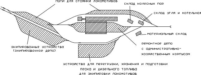 (схемы «в рыбках»), с учетом рассчитанных в п.7.2 параметров (числа стойл и путей в ремонтном депо, числа экипировочных позиций и путей в комплексе экипировочных устройств, числа путей для отстоя локомотивов в ожидании работы и в резерве).