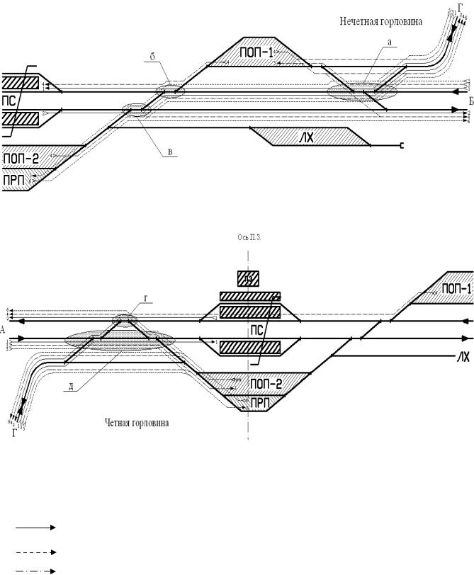 В курсовом проекте для определения минимально необходимого количества секций в приемо-отправочных парках станции рекомендуется на схеме каждой горловины нанести основные маршруты движения транспортных единиц (рисунки 2.6–2.8), на основании которых определяется значение М (таблица 2.4).