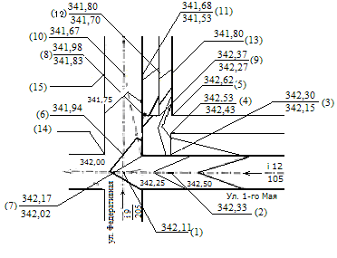 Для примера рассмотрим расположение горизонталей в пределах перекрестка на пересечении ул. 1-го Мая и ул. Федеративной. От центра перекрестка до точки 10 при заданной высоте сечения 0,25 м. будут располагаться горизонтали с отметками 342,00 м., 341,75 м.