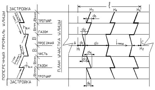 где Н1 и Н2 - проектные отметки точек А и С (рисунок 11) изменения продольного уклона улицы, либо центров перекрестков;