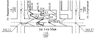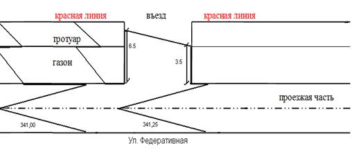 К примеру, для определения положения проектной горизонтали с отметкой 341,25 в границах проезда по ул. Федеративная необходимо вычислить отметки точек пересечения оси лотка проезжей части улицы с осями лотков въезда: