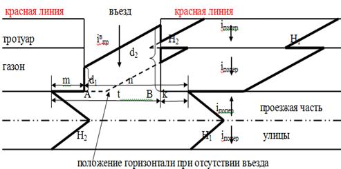 Далее вычисляют расстояния d1 и d2 по осям лотков въезда: d1 = (H2 - HA)/iвпр; d2 = (H2 - HB) / iвпр , где iвпр - продольный уклон по оси и лоткам въезда; принимается равным проектному поперечному уклону газона и тротуара.